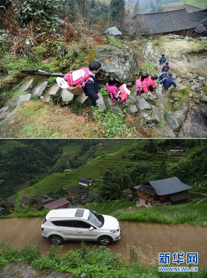 这是一张拼版照片,上图:在广西龙胜龙脊镇江柳村,余启贵老师背着背篓领着学生去学校(2013年2月26日摄);下图:在广西龙胜龙脊镇江柳村,余启贵老师开着自己的汽车带着学生去学校(7月7日摄)。新华社记者陆波岸摄