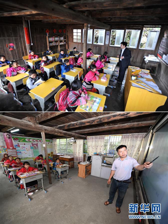 这是一张拼版照片,上图:在广西龙胜龙脊镇江柳村翁江小学,余启贵老师在给学生上课(2013年2月26日摄);下图:在广西龙胜龙脊镇江柳村翁江小学,余启贵老师在给学生上课(7月7日摄)。新华社记者陆波岸摄