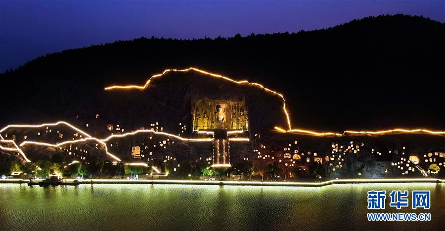 7月7日拍摄的洛阳龙门石窟景区夜景(无人机照片)。近日,河南洛阳的夜晚愈发缤纷多彩。立足于厚重的隋唐文化底蕴,洛阳正通过创新夜游产品打响“古都夜八点”品牌,激活文旅消费。新华社记者李安摄