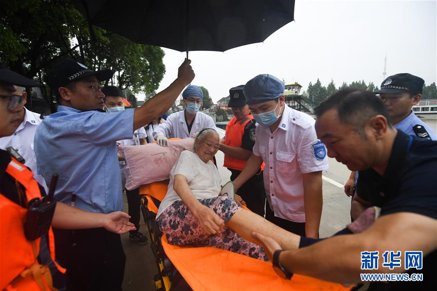 7月8日,应急人员将东洲街道五丰岛97岁瘫痪在床的董老太太撤离出来,安全转移到岸上。新华社记者徐昱摄