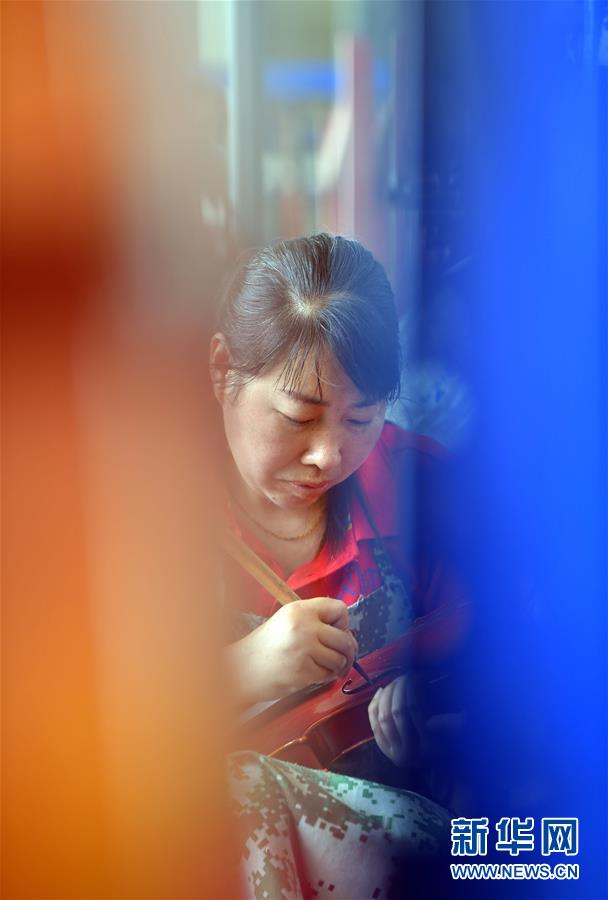 工人在河南驻马店市确山县提琴产业园提琴生产车间雕刻琴头(7月3日摄)。新华社记者李嘉南摄