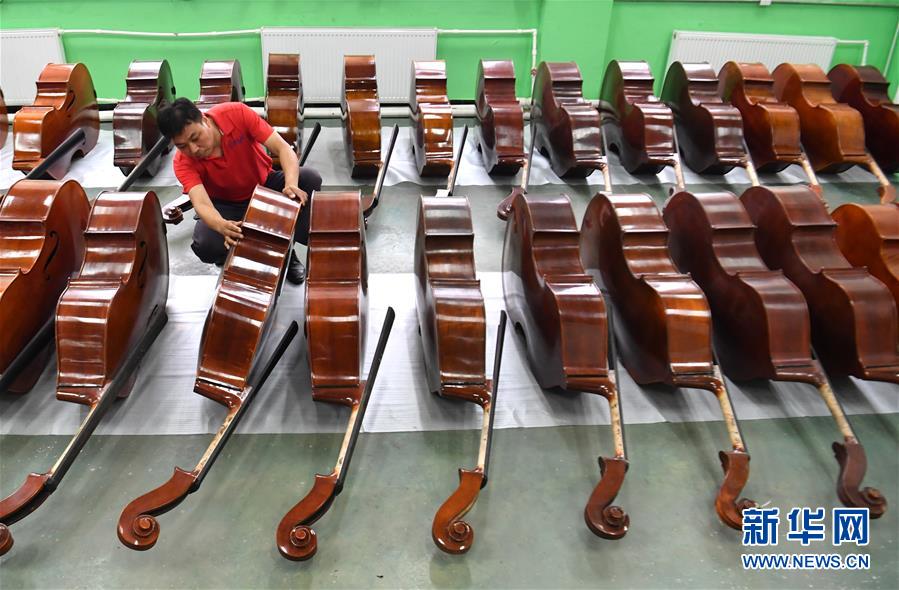工人在河南驻马店市确山县提琴产业园提琴生产车间检查提琴质量(6月23日摄)。新华社记者李嘉南摄