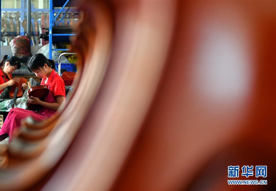 工人在河南驻马店市确山县提琴产业园提琴生产车间工作(7月3日摄)。新华社记者李嘉南摄