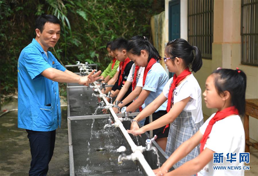 7月8日,陶雷为长垌小学的学生讲解科学洗手的方法。新华社记者周华摄