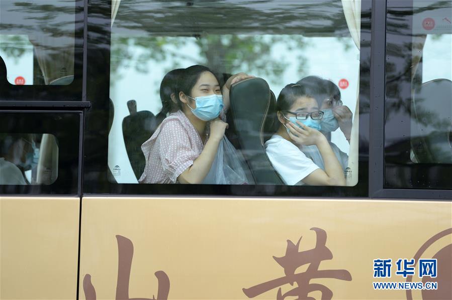 7月9日,考生乘坐大巴车抵达歙县第二中学考点。受强降雨影响,2020年高考安徽歙县考区7月7日未能如期开考,经研究并报教育部批准,歙县考区于9日启用2020年普通高等学校招生全国统一考试语文、数学(文、理)科目副题进行考试。新华社记者黄博涵摄