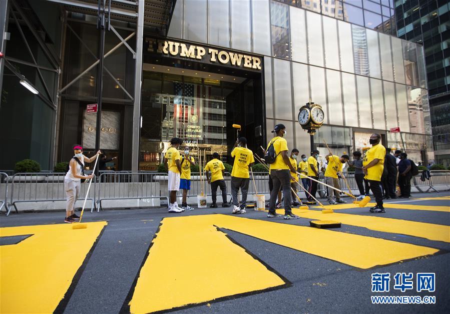 7月9日,在美国纽约第五大道特朗普大厦前,人们涂写“黑人的命也是命”标语。当天,数十人在纽约第五大道特朗普大厦前的路面上涂写“黑人的命也是命”标语。纽约市计划在多处地点涂写“黑人的命也是命”标语。新华社记者王迎摄