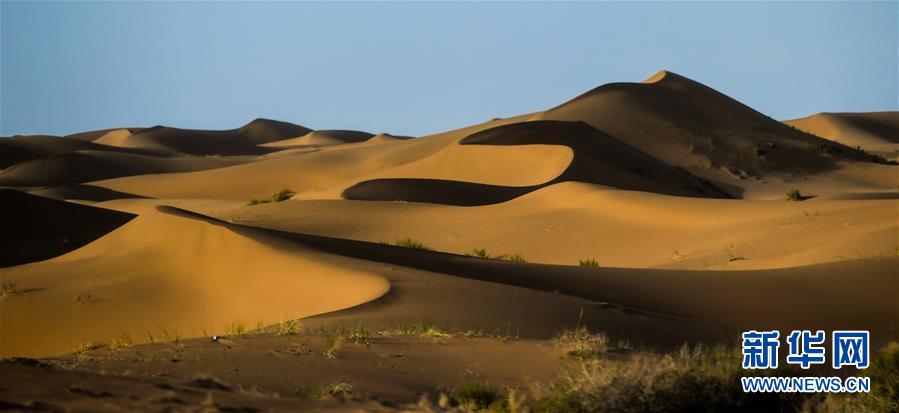 这是7月8日拍摄的腾格里沙漠风光。位于内蒙古自治区阿拉善左旗西南部和甘肃省中部边境的腾格里沙漠是我国第四大沙漠,总面积约为4.3万平方公里。夏日傍晚,腾格里沙漠连绵的沙丘被日光勾勒出美丽的线条,美不胜收。新华社记者连振摄
