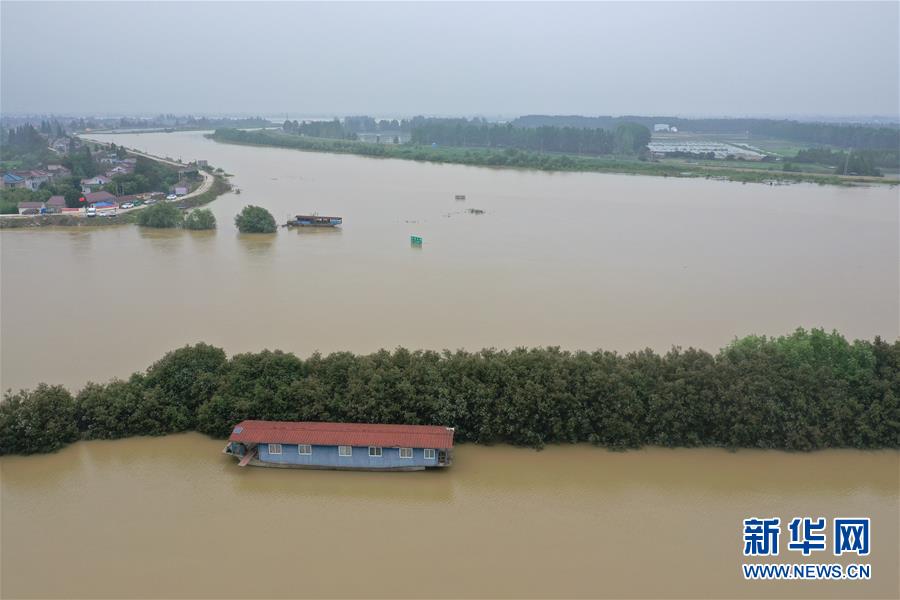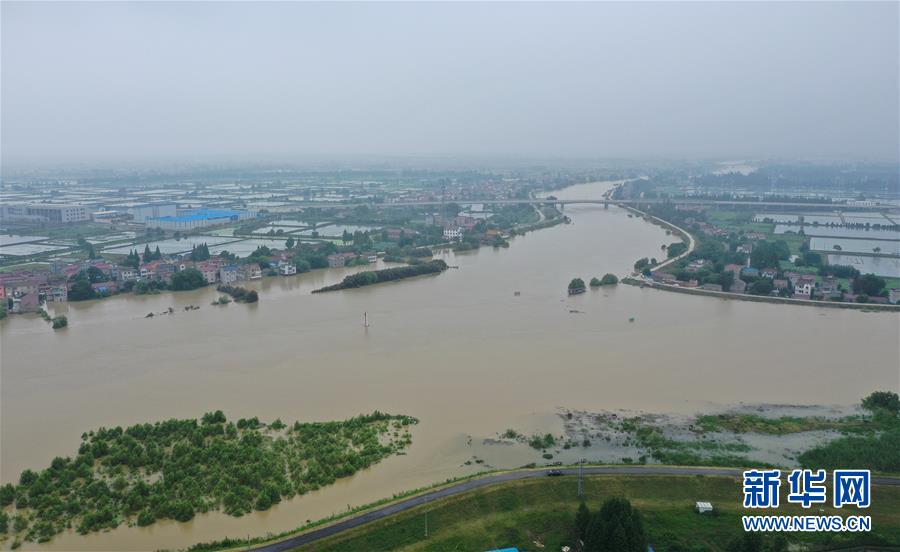 7月9日拍摄的水阳江南京高淳段(无人机照片)。入梅以来,江苏省南京市高淳区多次遭受强降雨,加上上游来水量大,截至7月9日8时,高淳境内水阳江水碧桥水位达到13.01米,超警戒水位2.51米。7月7日水阳江区域已启动防汛应急Ⅰ级响应。高淳区在水阳江区域堤防沿线设立241个防汛值守点,实施24小时值班值守。新华社记者季春鹏摄