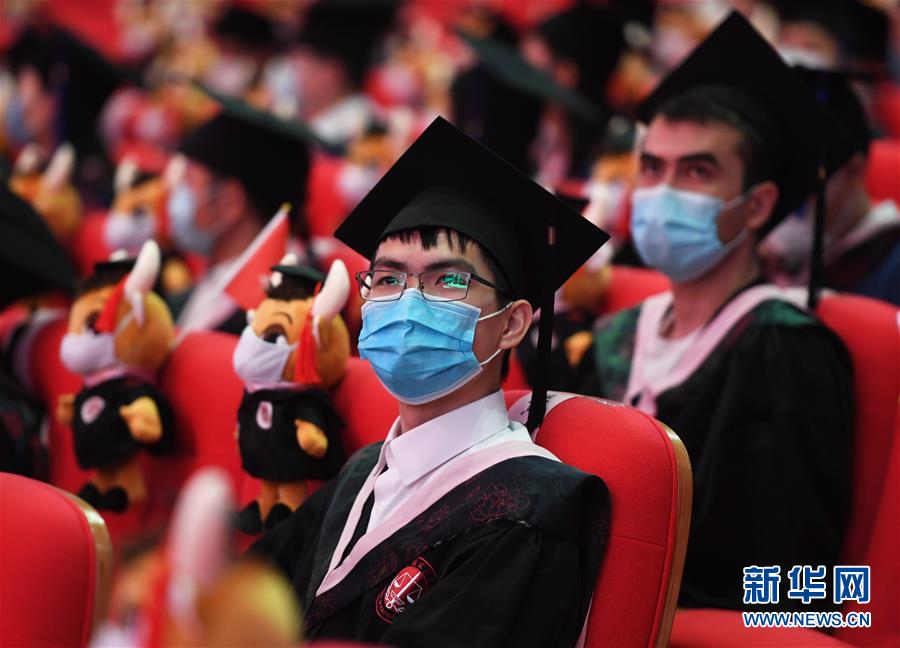 7月10日拍摄的中国政法大学2020届毕业典礼现场。当日,中国政法大学举行2020届毕业典礼。由于疫情防控需要,仅少量在校毕业生在中国政法大学昌平校区礼堂现场参加毕业典礼,更多毕业生通过线上直播参与。新华社记者任超摄