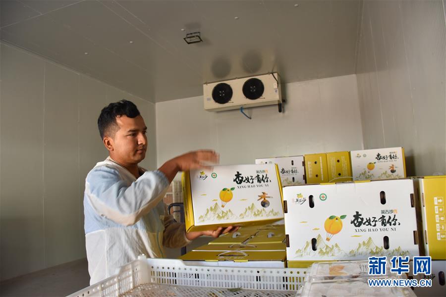 在新疆英吉沙县一家合作社内,员工将包装好的杏子放入冷库(7月3日摄)。新华社记者高晗摄