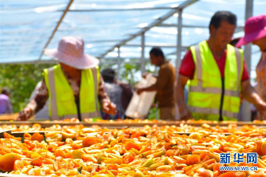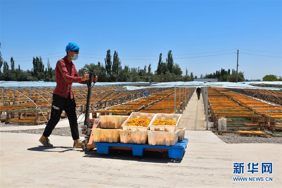 在新疆英吉沙县一家合作社内,员工在晾晒杏子(7月2日摄)。新华社记者高晗摄