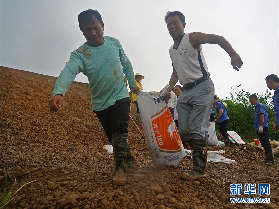 7月9日,邵忠如(前右)和村民们运送沙袋,封堵圩堤上的泡泉。新华社记者万象摄