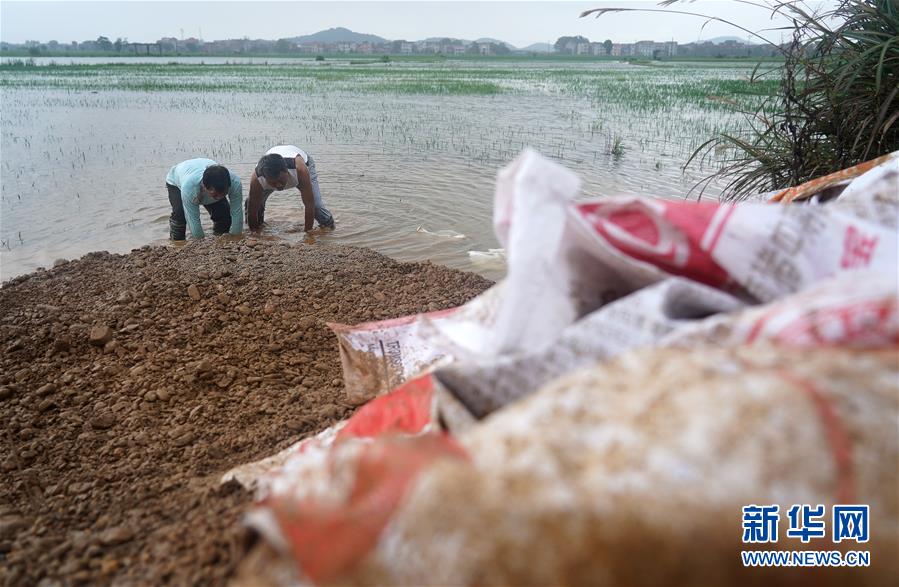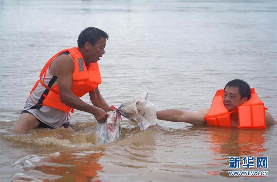 7月9日,为应对洪峰到来,邵忠如(左)在水中加固圩堤。新华社记者万象摄