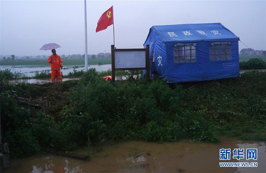 7月9日,邵忠如在圩堤上的救灾棚旁观察水情。新华社记者万象摄