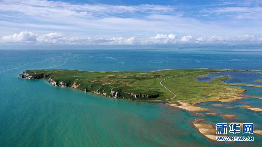 7月10日拍摄的青海湖风光(无人机照片)。盛夏时节,被誉为“中国最美湖泊”的青海湖畔景色宜人,蓝天、白云、湖水与草原组成一幅壮美的画卷。新华社记者张宏祥摄