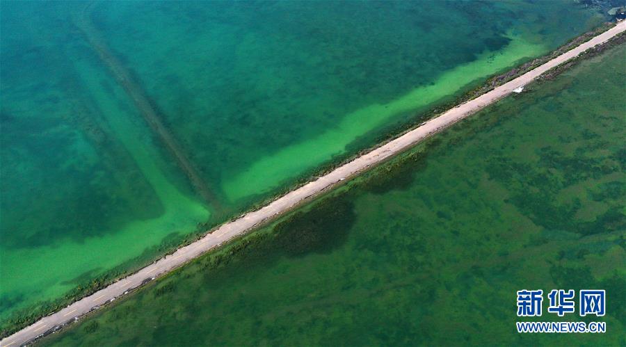 7月10日拍摄的青海湖畔风光(无人机照片)。盛夏时节,被誉为“中国最美湖泊”的青海湖畔景色宜人,蓝天、白云、湖水与草原组成一幅壮美的画卷。新华社记者张宏祥摄