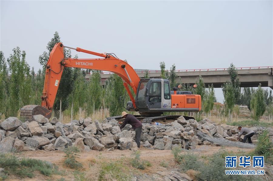 7月11日,工人在黄河内蒙古磴口段南套子险工段进行除险加固。新华社记者李云平摄