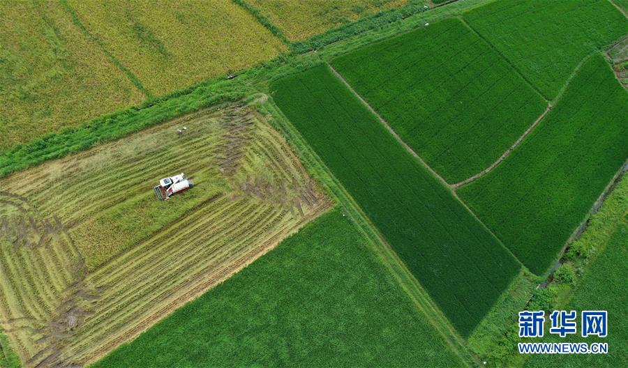 7月11日,在湖南省衡阳市衡阳县台源镇台九村,村民驾驶收割机收割早稻(无人机照片)。近日,湖南各地农村陆续进入“双抢”季,农民紧抓农时,抢收抢种,力争粮食稳产丰收。新华社记者赵众志摄
