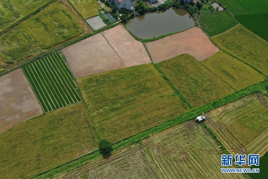 7月11日,在湖南省衡阳市衡阳县台源镇台九村,村民驾驶收割机收割早稻(无人机照片)。近日,湖南各地农村陆续进入“双抢”季,农民紧抓农时,抢收抢种,力争粮食稳产丰收。新华社记者赵众志摄