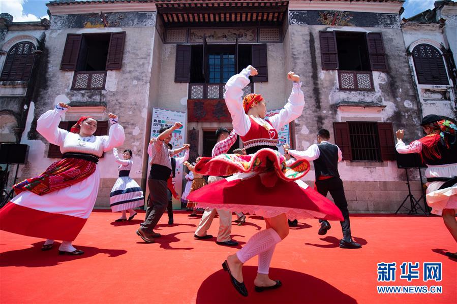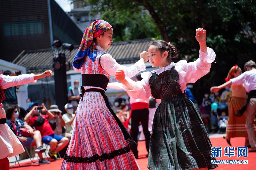 7月11日,演员在“庆祝澳门历史城区申遗成功15周年嘉年华”上表演土风舞。新华社记者张金加摄