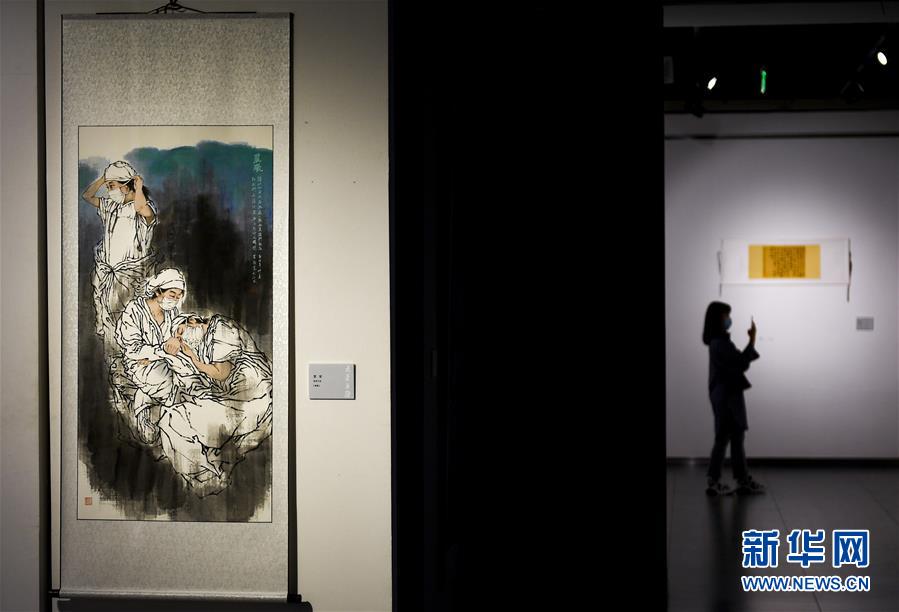 7月11日,观众在吉林省抗疫主题美术·摄影作品展上参观。近日,“大爱无疆——吉林省抗疫主题美术·摄影作品展”在吉林省工艺美术馆与观众见面。展览共展出抗击新冠肺炎疫情主题书法、国画、油画、摄影等作品367件(组)。新华社 记者许畅 摄