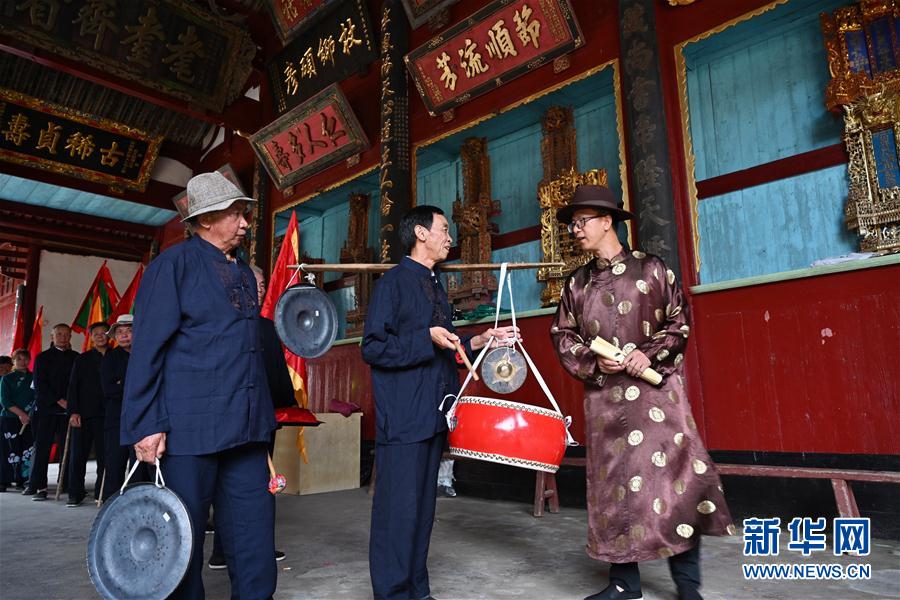 7月4日,浦源村民在村里的郑氏宗祠集合,准备展示鱼祭习俗。鱼祭习俗是为死去的鲤鱼举行送葬仪式,是浦源村特有的习俗。新华社记者 姜克红 摄