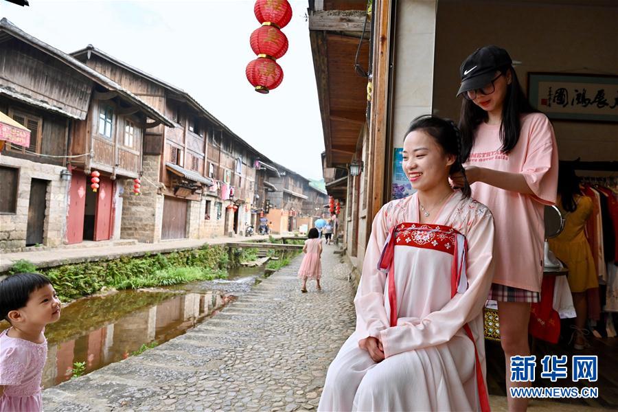 7月4日,游客苏梦(右二)在浦源村一家汉服租赁店体验汉服文化,她的女儿在一旁好奇地观看。新华社记者 姜克红 摄