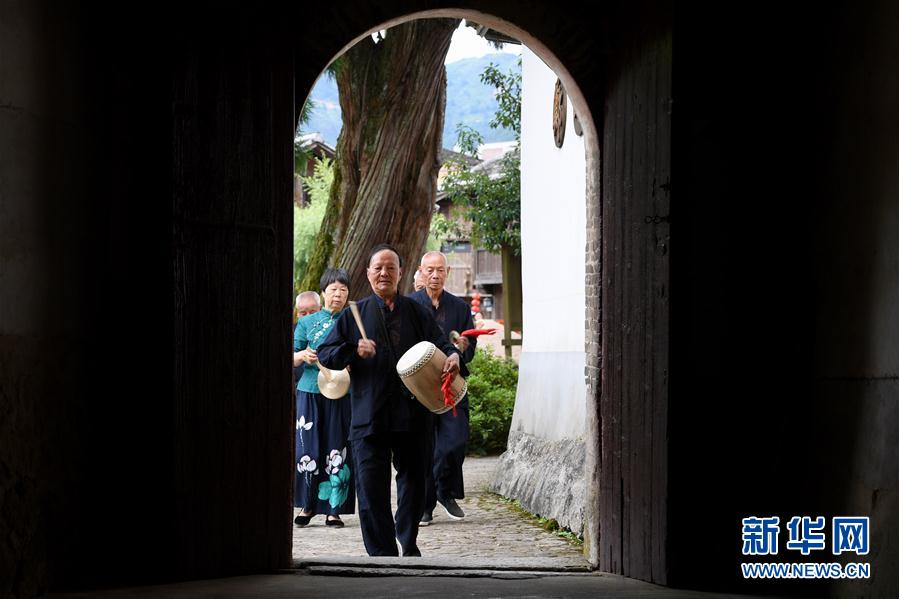 7月4日,浦源村民展示鱼祭习俗(无人机照片)。鱼祭习俗是为死去的鲤鱼举行送葬仪式,是浦源村特有的习俗。新华社记者 姜克红 摄