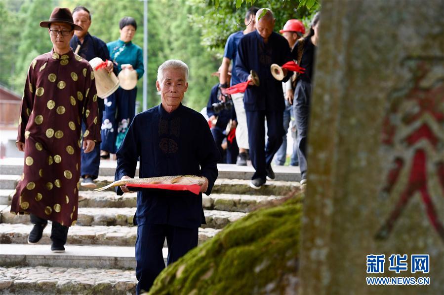 7月4日,浦源村民展示鱼祭习俗。鱼祭习俗是为死去的鲤鱼举行送葬仪式,是浦源村特有的习俗。新华社记者 姜克红 摄
