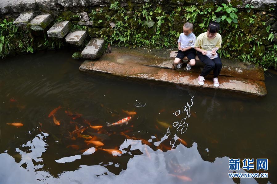 7月3日,小朋友在浦源村鲤鱼溪畔喂食溪中的鲤鱼。新华社记者 姜克红 摄