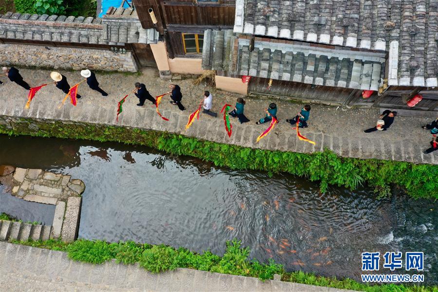 7月4日,浦源村民展示鱼祭习俗(无人机照片)。鱼祭习俗是为死去的鲤鱼举行送葬仪式,是浦源村特有的习俗。新华社记者 姜克红 摄