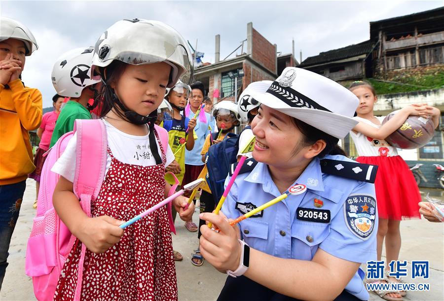 7月11日,柳州市交警支队民警给小朋友赠送交通标志铅笔。当日,广西柳州市交警支队的民警来到融水苗族自治县大浪镇大新村红邓屯教学点,开展暑期交通安全教育活动,增强孩子们的安全出行意识。新华社记者黄孝邦摄