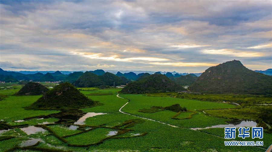 这是7月8日拍摄的普者黑国家湿地公园的夕阳景观(无人机照片)。