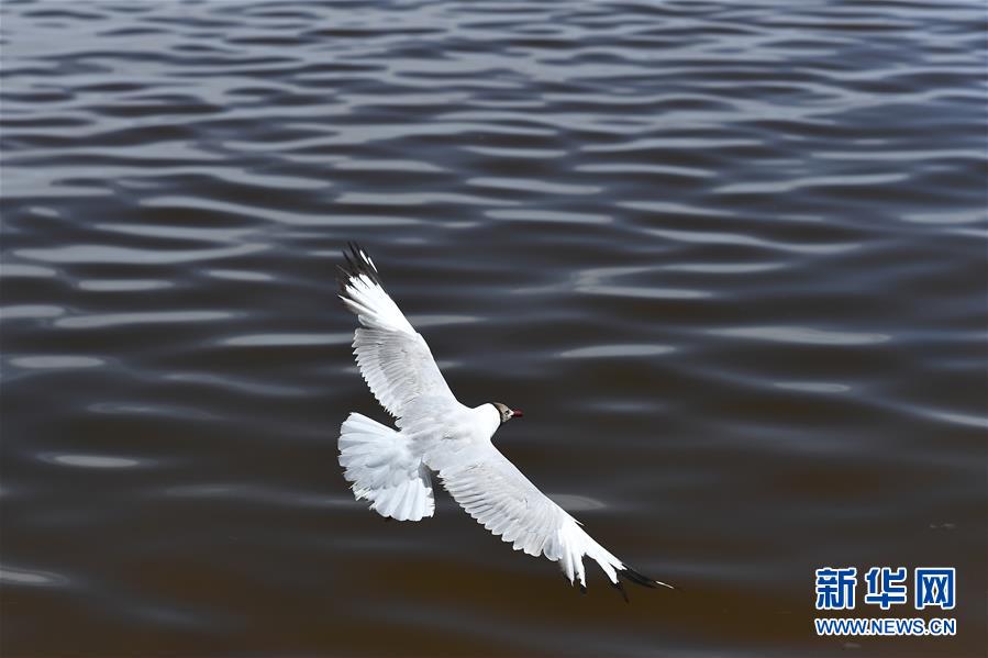 7月10日,一只棕头鸥从青海湖湖面上飞过。盛夏时节,被誉为“中国最美湖泊”的青海湖畔景色宜人,蓝天、白云、湖水与草原组成一幅壮美的画卷。新华社记者 张宏祥 摄