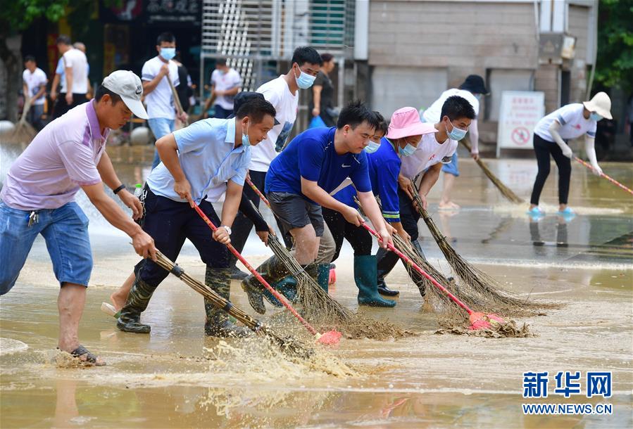 7月12日,融水苗族自治县文化体育广电和旅游局清淤小分队在芦笙广场清理地面。当日,在广西柳州市融水苗族自治县,融江洪水退去,当地相关部门组织多支清淤排险小分队,积极开展灾后恢复工作。新华社记者 黄孝邦 摄