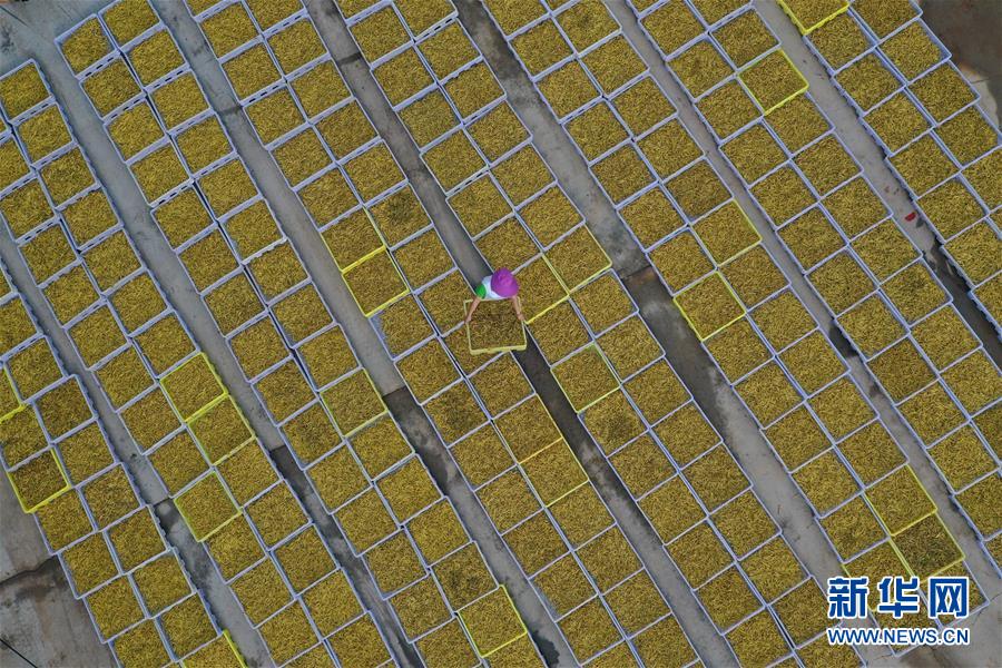 7月12日,祁东县黄土铺镇雁隆食品公司内,工人在晾晒黄花菜(无人机照片)。新华社记者 赵众志 摄