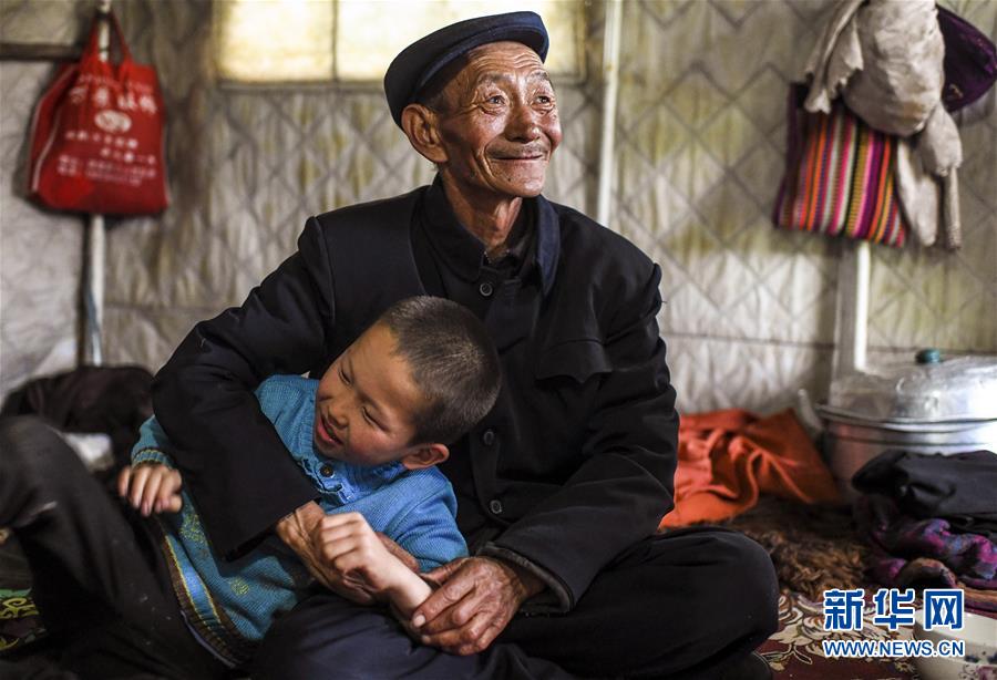 在新疆伊犁特克斯县境内的夏牧场里,一位老人在帐篷内和孙子一起玩耍(7月1日摄)。新华社记者 王菲 摄