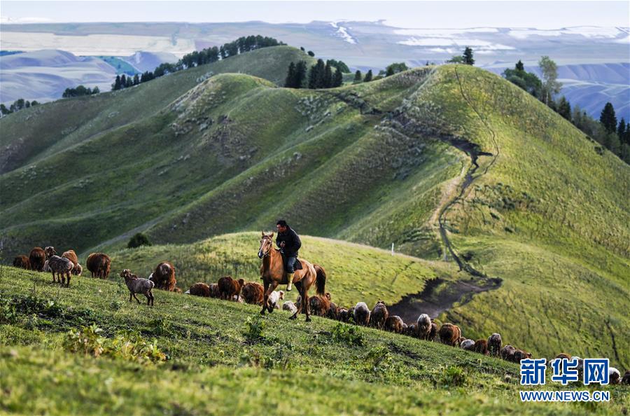 在新疆伊犁特克斯县境内的夏牧场里,一位牧民在放牧(7月2日摄)。新华社记者 王菲 摄