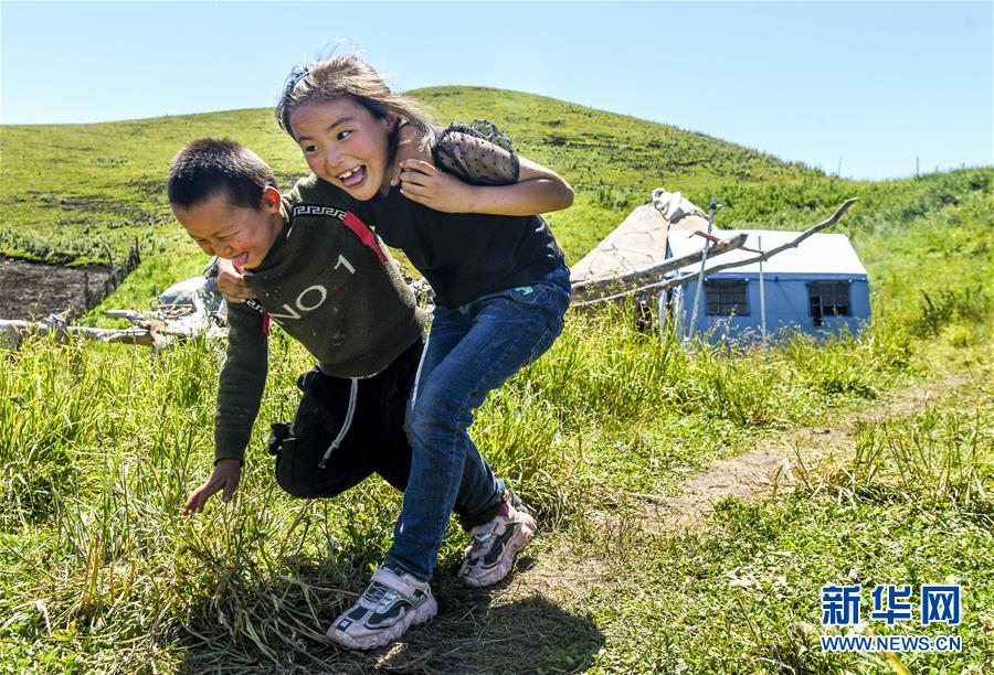 在新疆伊犁特克斯县境内的夏牧场里,两名小朋友在玩耍(7月2日摄)。新华社记者 王菲 摄