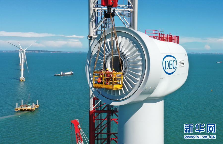 福建福清兴化湾二期海上风电场吊装10兆瓦海上风电机组(6月12日摄,无人机照片)。记者7月13日从三峡集团了解到,国内首台10兆瓦海上风电机组日前在三峡集团福建福清兴化湾二期海上风电场成功并网发电,这是目前我国自主研发的单机容量亚太地区最大、全球第二大的海上风电机组,刷新了我国海上风电单机容量新纪录。新华社记者 林善传 摄