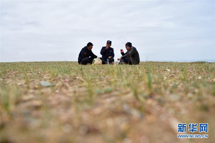 在可可西里索南达杰保护站,龙周才加(中)与队友才仁多杰(左)、王文豪在管护区域巡查时吃午饭(6月30日摄)。新华社记者 张龙 摄