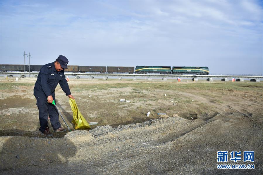 在可可西里索南达杰保护站附近青藏铁路沿线,龙周才加在捡拾垃圾(6月30日摄)。新华社记者 张龙 摄