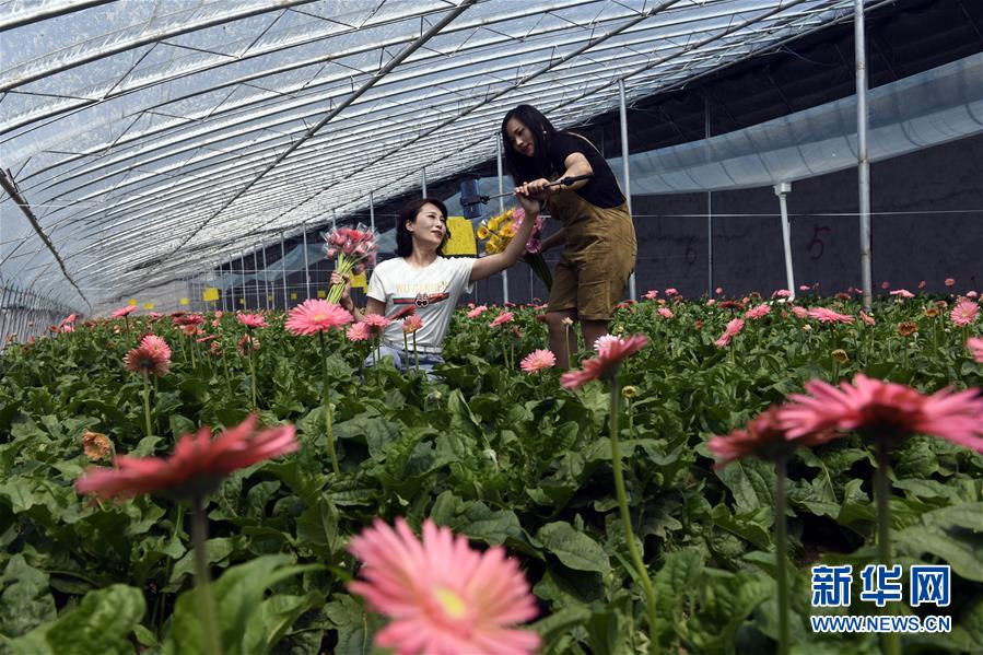7月10日,在莒县招贤镇西黄埠村盛世花卉种植专业合作社,驻村第一书记钟翠娟(左)在扶郎花种植大棚进行网上直播。山东省日照市莒县招贤镇有20余年的玫瑰花、扶郎花种植历史。目前,招贤镇投资建设的高标准特色鲜花种植大棚可年产700-800万枝优质玫瑰和扶郎花等,带动周边乡镇的建档立卡贫困户脱贫增收。新华社记者 范长国 摄