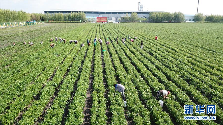 7月14日,在克东县昌盛乡青刀豆蔬菜种植示范基地,雇工在采摘青刀豆(无人机照片)。黑龙江省克东县地处大兴安岭南麓,近年来,当地大力发展扶贫产业,探索“小院经济”、订单种植和加工产业相融合新方式,带动农民就业和脱贫增收。新华社记者 王建威 摄
