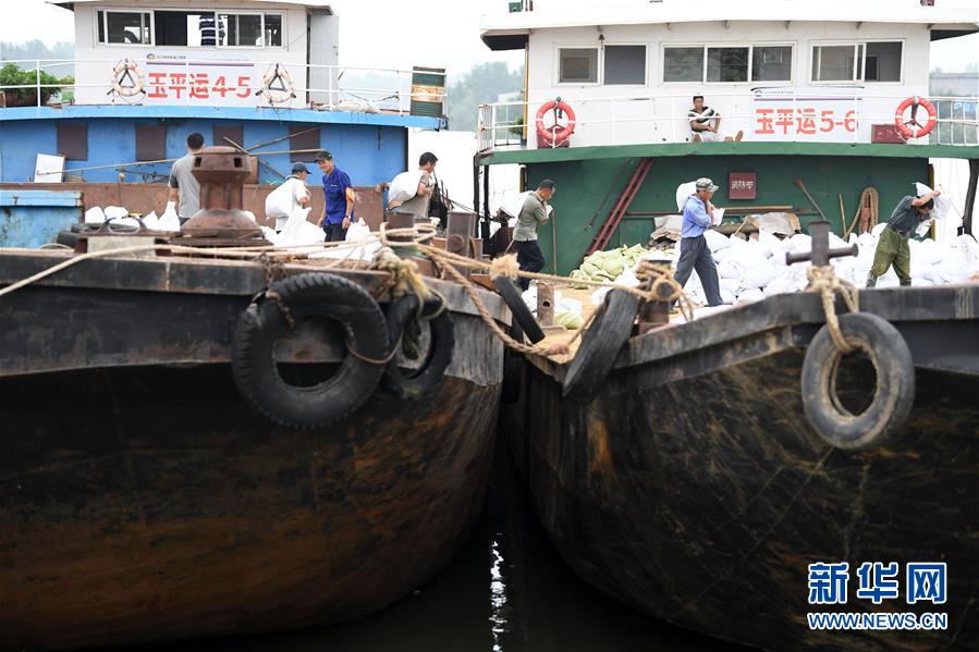 7月14日,当地村民往船只上搬运砂石袋。近日,受洪水影响,安徽省望江县华阳镇境内的江调圩内部道路漫水,抢险车辆无法进入。当地防汛部门组织船只装载砂石袋等防汛物资,运往圩堤保防汛。新华社记者 刘军喜 摄