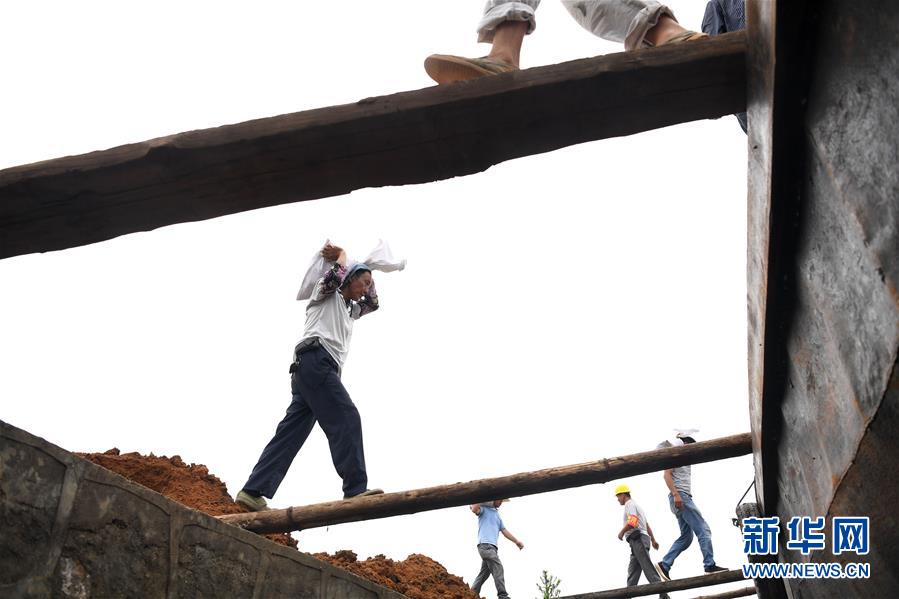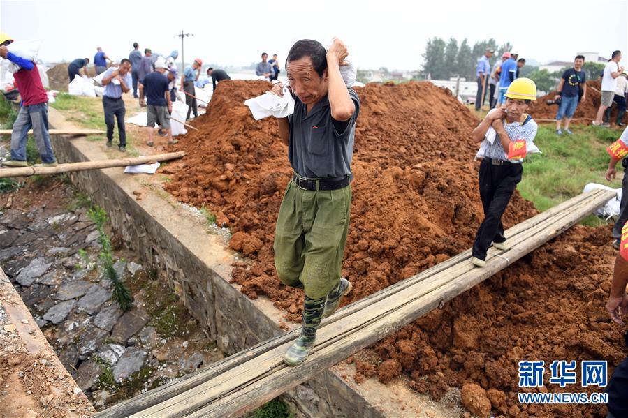 7月14日,当地村民往船只上搬运砂石袋。近日,受洪水影响,安徽省望江县华阳镇境内的江调圩内部道路漫水,抢险车辆无法进入。当地防汛部门组织船只装载砂石袋等防汛物资,运往圩堤保防汛。新华社记者 刘军喜 摄