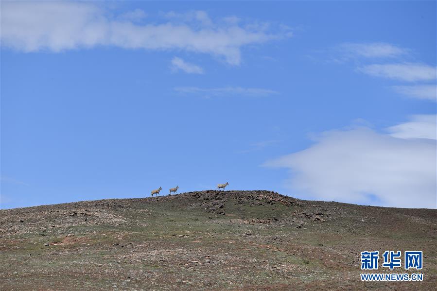 7月7日在可可西里卓乃湖区域拍摄的藏羚羊。目前正值藏羚羊产仔季。来自青海三江源、新疆阿尔金山、西藏羌塘等地的藏羚羊来到位于青海省可可西里腹地、被誉为“藏羚羊大产房”的卓乃湖区域产仔。新华社记者 张龙 摄