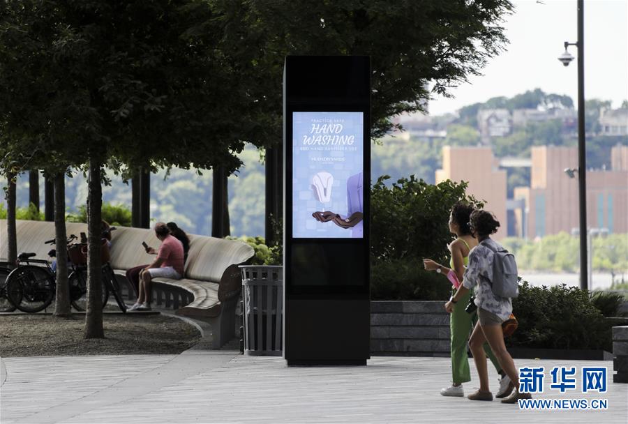 7月14日,在美国纽约一家尚未恢复店内购物的购物中心外,电子屏介绍正确洗手的方式。美国约翰斯·霍普金斯大学:截至北京时间15日6时34分,全球新冠确诊病例达13258016例,死亡病例为576752例。美国是全球疫情最严重的国家,确诊病例达3416222例,死亡病例为136319例。新华社记者 王迎 摄