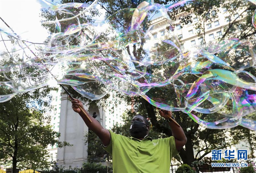 7月14日,美国纽约街头一名戴口罩的男子表演“泡泡秀”。美国约翰斯·霍普金斯大学:截至北京时间15日6时34分,全球新冠确诊病例达13258016例,死亡病例为576752例。美国是全球疫情最严重的国家,确诊病例达3416222例,死亡病例为136319例。新华社记者 王迎 摄