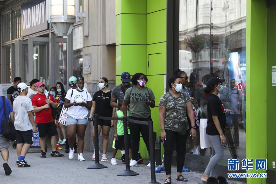 7月14日,人们在美国纽约排队等待进店购物。美国约翰斯·霍普金斯大学:截至北京时间15日6时34分,全球新冠确诊病例达13258016例,死亡病例为576752例。美国是全球疫情最严重的国家,确诊病例达3416222例,死亡病例为136319例。新华社记者 王迎 摄